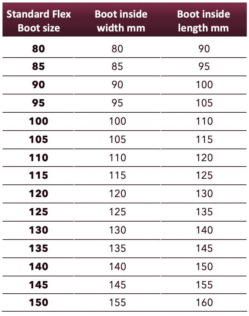 Flex Bootsit on saatavilla useassa eri koossa pienistä poneista hevosiin saakka. Bootseja on kahta eri mallia: standardi ja wide (pyöreä) malli. “W” bootsit kokonumeron perässä kertoo, että kyseessä on wide-mallin bootsi.