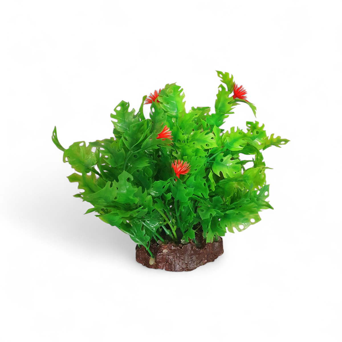 Muovikasvi akvaarion sisustukseen, ilmaletkuliitännällä. Kasviin voidaan liittää ilmapumppu, jolloin saadaan aikaan hienoja kuplia! Mitat noin 14cm x 14cm x 17cm (korkeus).